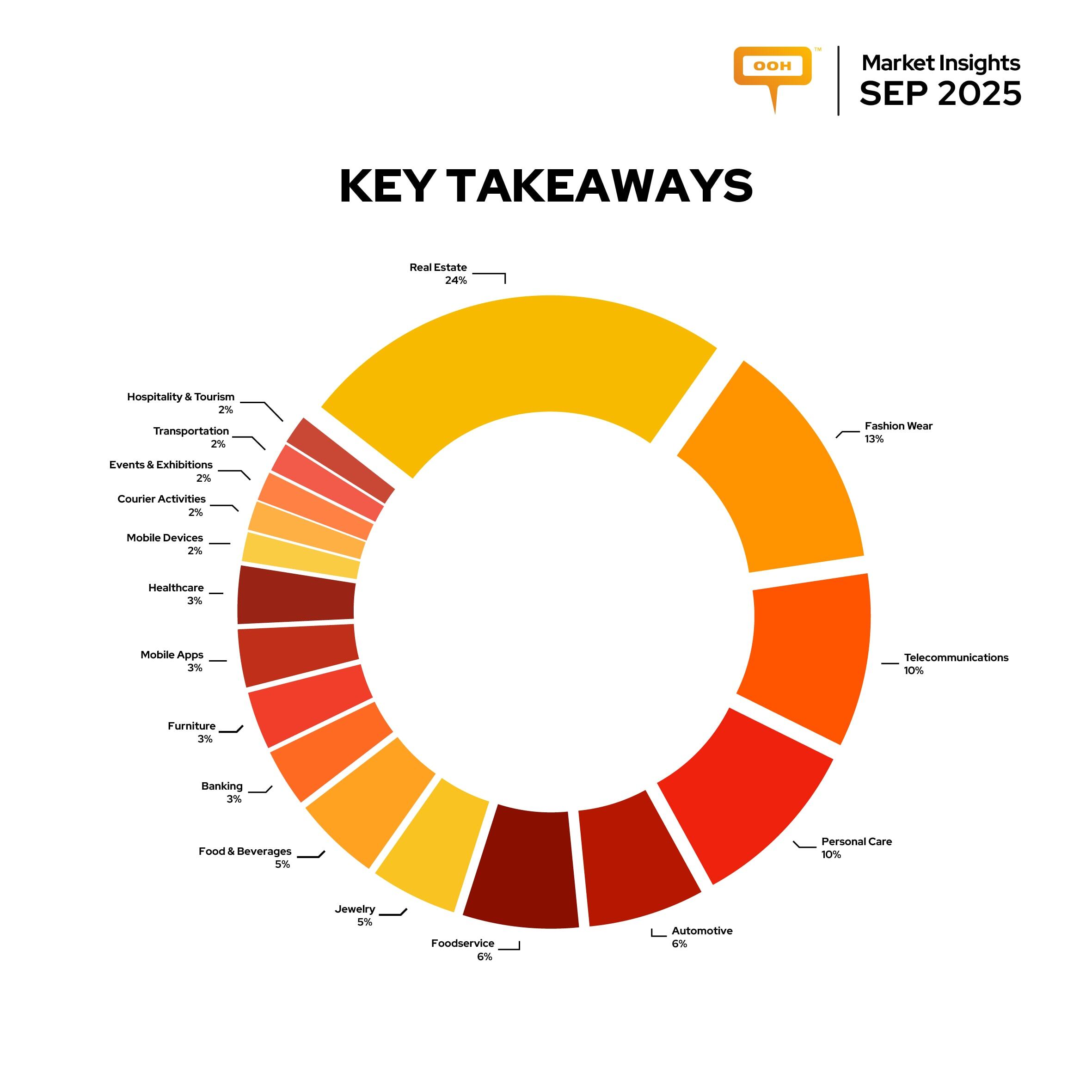 The Out-of-Home (OOH) scene across the UAE remained active in Sep 2025, with industries competing for audience attention through both traditional and digital formats. According to recent tracking, real estate once again emerged as the leading sector, driving 15 campaigns across billboards, digital screens, and combined-format sites. This reaffirms the sector’s long-standing dominance, as developers continue to rely on OOH to showcase new projects, strengthen visibility, and sustain competitive momentum.