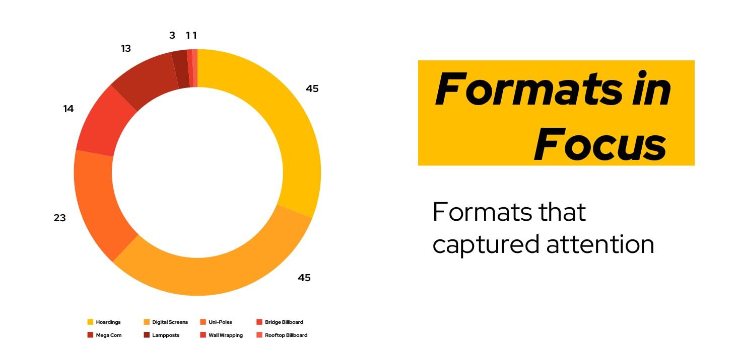 When it comes to formats, Digital Screens (45 placements / 50%) and Hoardings (45 placements / 50%) led the mix, reaffirming their position as the most dominant platforms for large-scale visibility and dynamic brand expression across the UAE’s OOH scene.