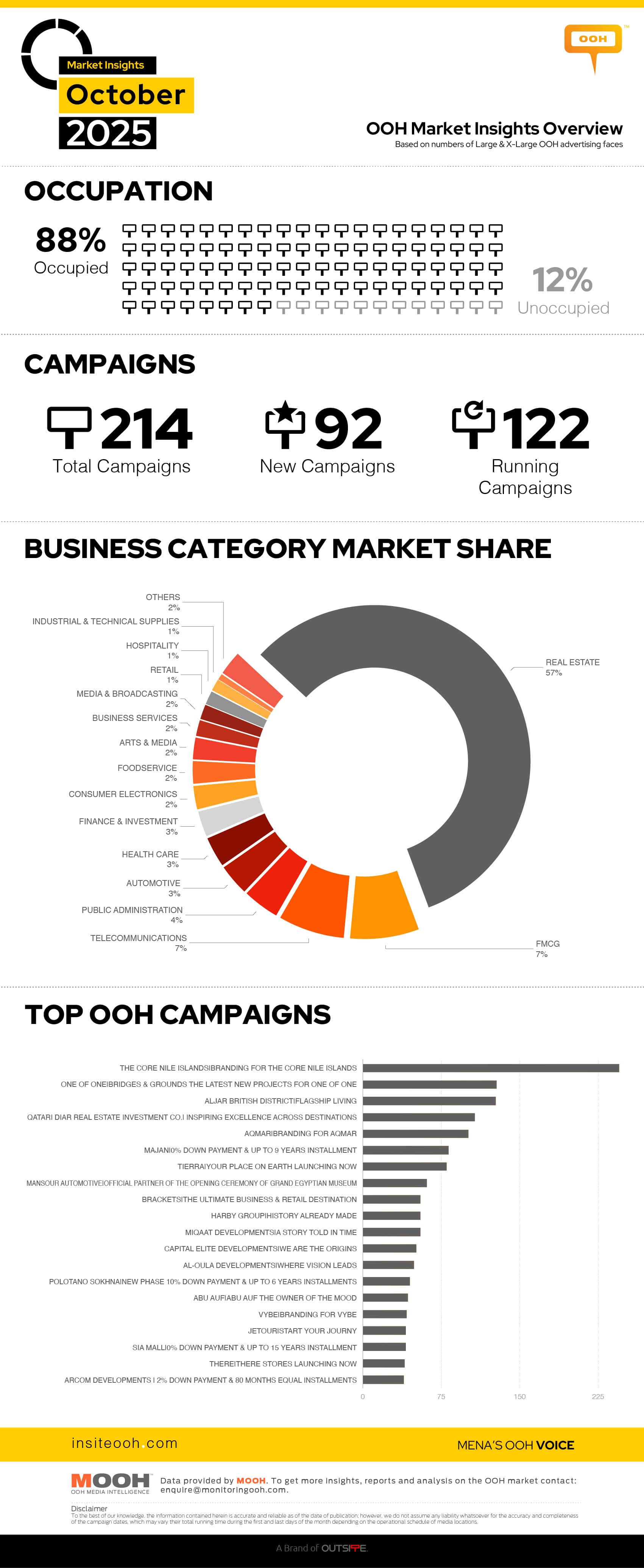 October 2025 recorded an overall occupancy rate of 88.4%, reflecting a clear year-on-year improvement from the more moderate activity observed in October 2024. With 17,314 occupied faces out of 19,600 monitored across Greater Cairo, the market demonstrated stronger utilization and heightened advertiser engagement. A total of 214 campaigns were active throughout the month, comprising 92 new launches alongside a solid base of ongoing activity, signaling sustained confidence in OOH as a reliable, high-visibility communication channel. The Real Estate sector remained the principal growth engine, reinforcing its long-standing dominance following the softer performance seen in October 2024. The FMCG sector also expanded its footprint, building on last year’s upward momentum as brands continued investing in consistent, high-frequency exposure. Meanwhile, Telecommunications activity, which saw a slight decline in 2024, stabilized this year as operators refined their placement strategies. Healthcare and Finance & Investment stayed broadly aligned with last year’s marginal shifts, maintaining steady participation without significant fluctuation. Overall, October 2025 presented a robust and well-balanced OOH landscape, where sectoral recovery, renewed advertiser spending, and the growing influence of digital formats contributed to a more agile, performance-driven outdoor advertising environment across Cairo’s metropolitan network.