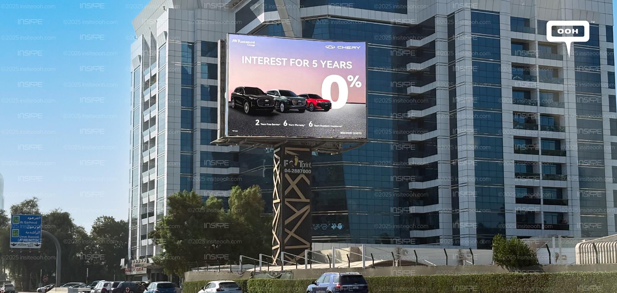 Every execution is designed to catch the eye in seconds but stay in the mind far longer, merging practicality with emotional appeal in a way that strikes a chord in car-crazy culture. The first billboard draws the viewer right into a sense of immediate futuristic calm. Dominated by the TIGGO 9 Plug-In Hybrid, it is a visual study in controlled power, placing the model at the center of a minimalist architectural setting. Its green-blue finish catches sunlight and reflects the sky, shifting subtly as drivers pass by, amplifying the impression of motion even at a standstill. The charging station beside the vehicle serves not just as a functional detail but as a narrative anchor, hinting at the brand’s commitment to electrified mobility without overwhelming the scene. Above it, the AW Rostamani Group name sits with quiet authority, lending trust and familiarity to a vehicle that represents Chery’s latest leap forward.
