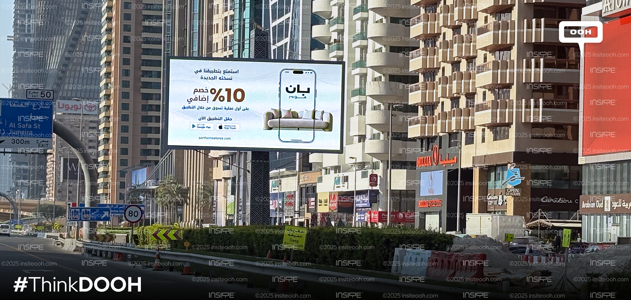 Breaking Down the Billboards, across Dubai’s major digital and static placements, the creative direction stays loyal to Pan Home’s clean, spacious design language. A white backdrop, a centered hero sofa, and an oversized phone frame immediately communicate the campaign’s focus: the new and improved app experience. The “Extra 10% Off” offer sits boldly beside it, ensuring the message lands instantly.