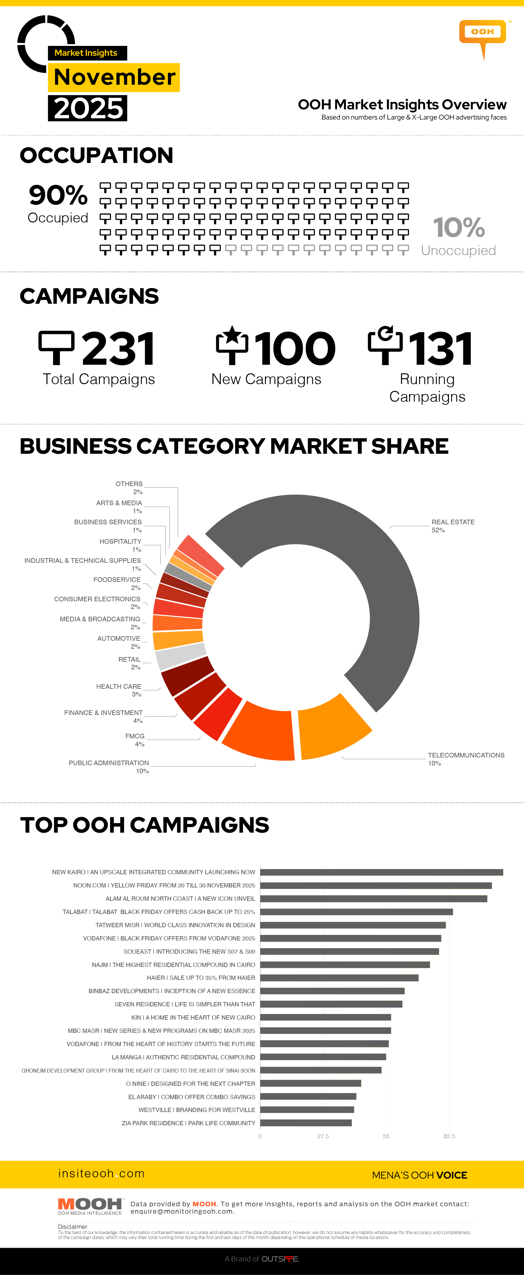 November 2025 recorded an overall occupancy rate of 90.1%, marking a clear improvement compared to November 2024. Out of 22,760 monitored faces across Greater Cairo, 20,500 were actively occupied, demonstrating stronger utilization and heightened advertiser engagement. During the month, a total of 214 campaigns were active, including 92 new launches alongside a robust base of ongoing activity, reflecting sustained confidence in OOH as a high-visibility, results-driven channel.