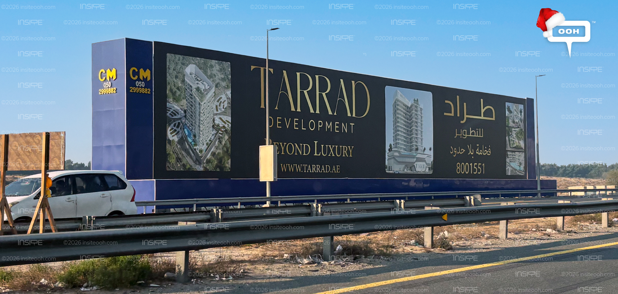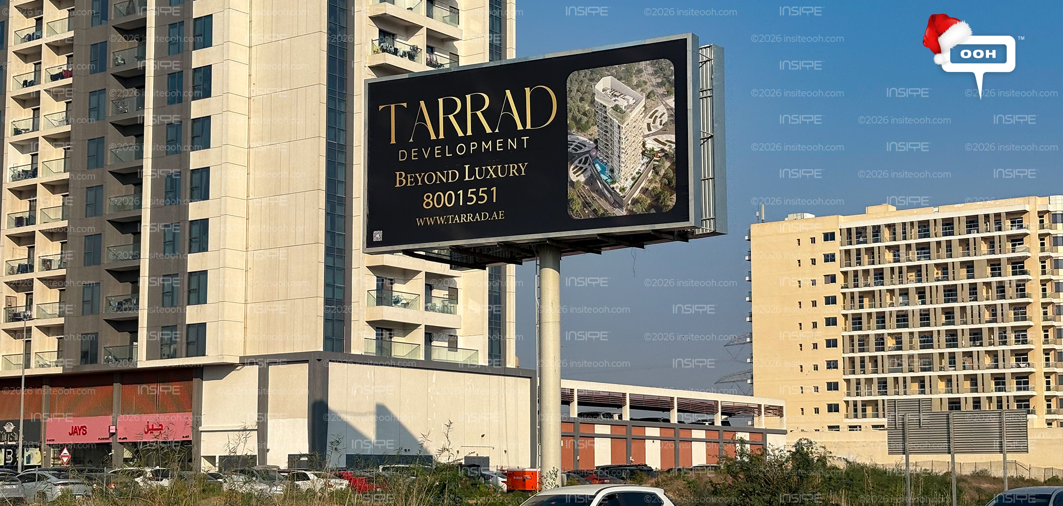 Following their previous OOH campaign, these real estate billboards do not reveal much. Only: a name, a project render, and the line “Beyond Luxury.” They also add a call to action, AKA a phone number. Tarrad Development appears again and again across major routes in the UAE (long-format hoardings, clean layouts, consistent color palettes), doing the same thing every time: making sure you remember the name.