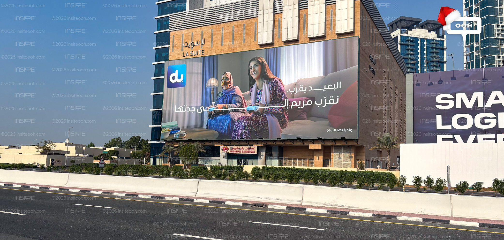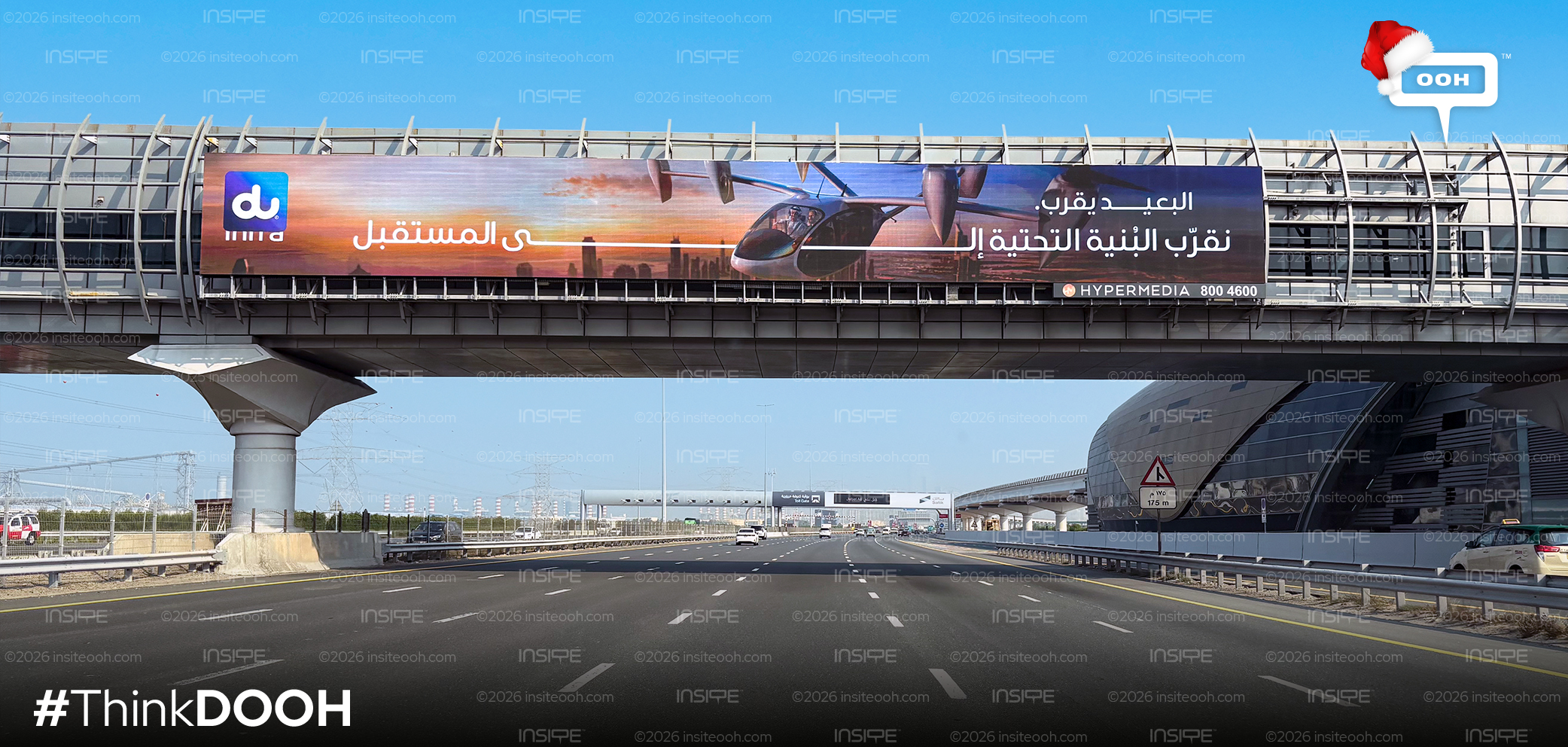 Following their prior appearance, the commanding visuals feature a futuristic flying vehicle hovering above a city at dusk. The warm gradient of the sky melts into the cool blues of du’s brand palette, visually bridging imagination and reality. The Arabic line speaks of tomorrow and infrastructure, grounding the futuristic imagery in something tangible and national. This is not science fiction for spectacle’s sake; it’s a promise. By placing advanced mobility against a recognizably Emirati skyline, du positions itself as an active builder of the future, not a distant observer. The billboard’s sheer length mirrors the idea of progress stretching forward, uninterrupted.