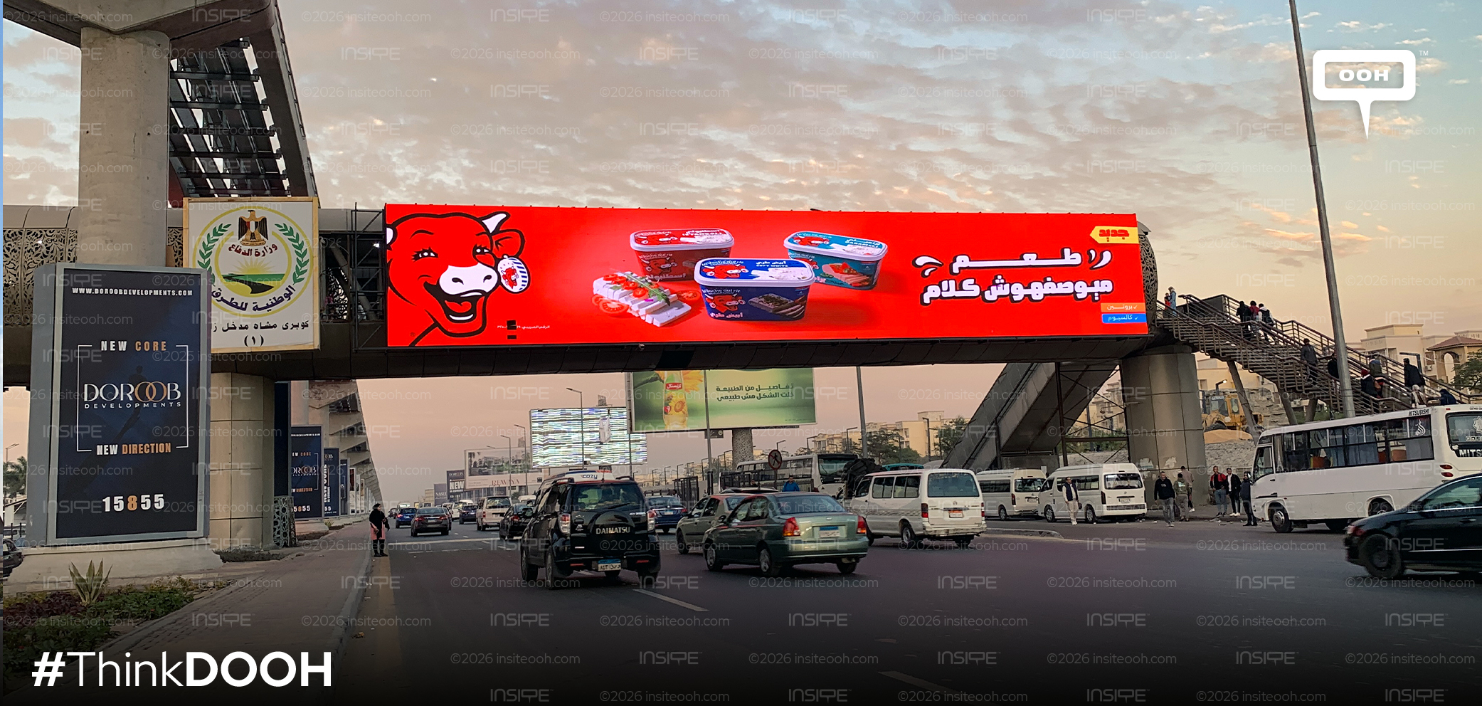 Similar to their prior appearance, at the center of the visual is La Vache Qui Rit's iconic laughing cow, supersized and emotive, smiling directly at passersby. The illustration isn't for decoration; it's strategic. That known face instantly triggers decades of brand memory, trust, and warmth. Next to it, the lineup of new products (Istambuli, White cheese & Barameli) is center-stage, with several tubs of cheese shown in a clean, slightly angled formation that gives them depth and appeals to appetite. Each pack is crisp in color and clearly labeled, making sure the message lands in seconds, which is vital on fast-moving Cairo roads.
