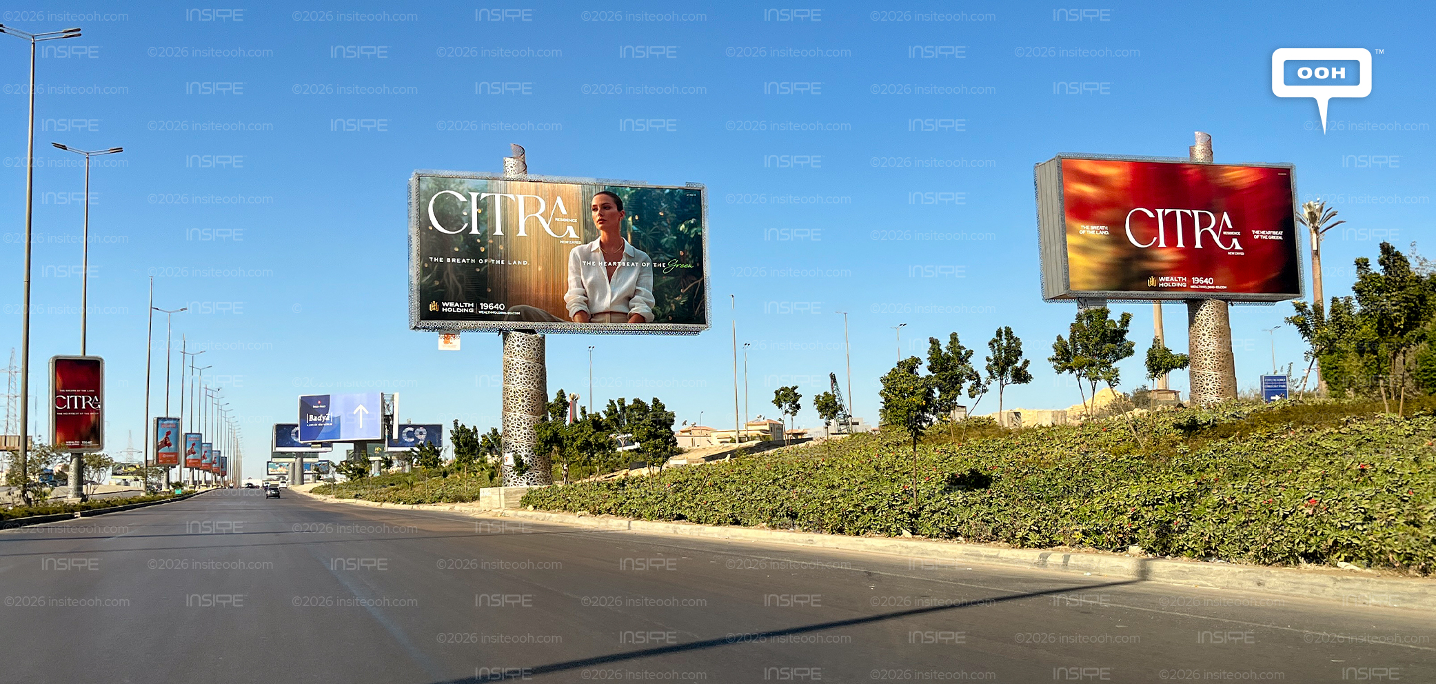 The focal visual identity is always the CITRA lettering in a high-contrast serif font accompanied by two short lines distributed between left and right corners of the design: “THE BREATH OF THE LAND.” and “THE HEARTBEAT OF THE GREEN.” Everything else – the Wealth Holding visual identity, the hotline 19640, the location in New Zayed, and the website – stays low-key and small in the design, making it easy to recognize at a distance before looking closely.