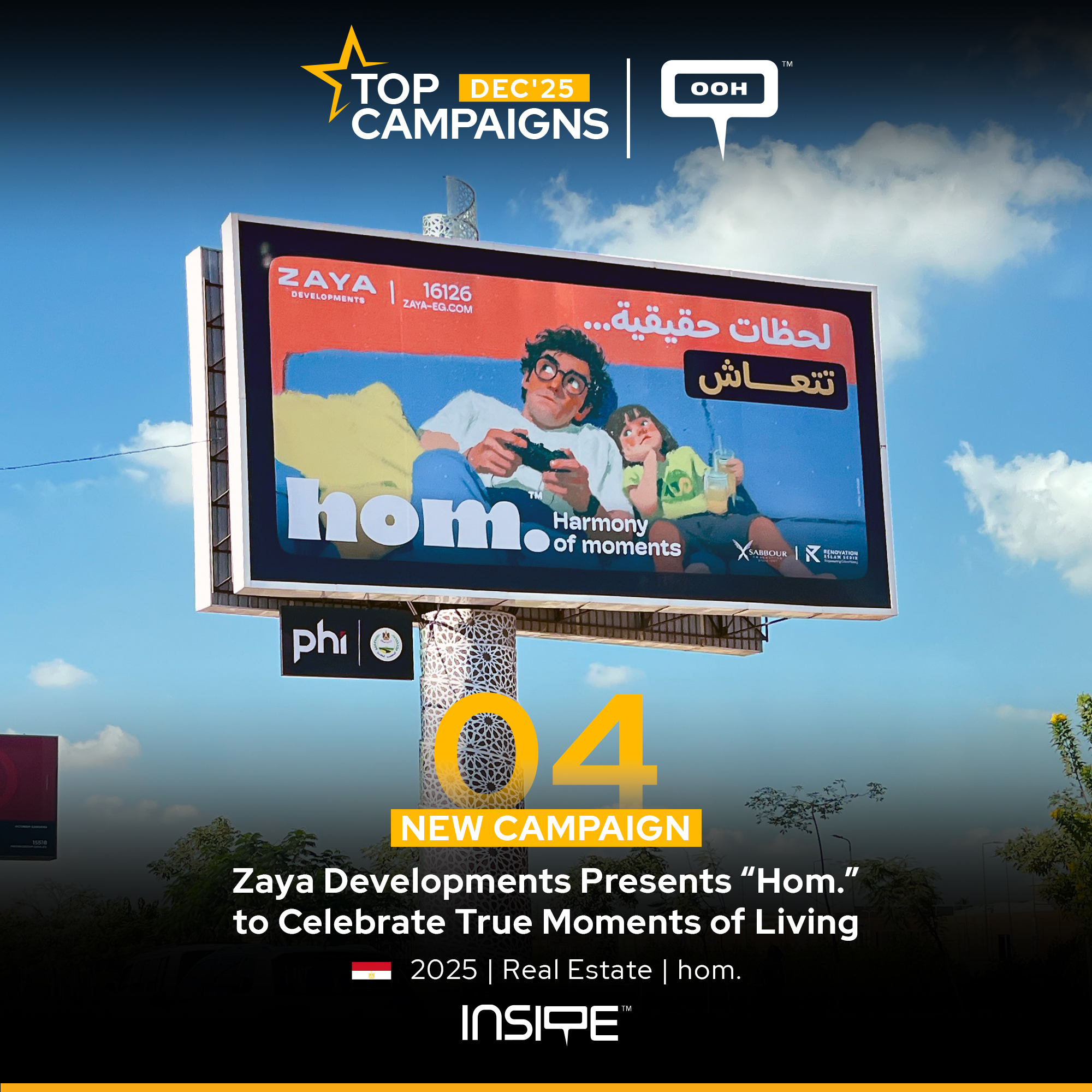 Zaya Developments’ OOH campaign for hom. captures the warmth of everyday family life, using soft illustrations and calm colors to convey genuine, lived moments. Taglines like “Real moments… lived” and “Harmony of moments” reinforce the emotional, culturally resonant message. The visuals balance modern architecture with intimate, ordinary scenes, emphasizing comfort and connection. The campaign prioritizes storytelling over hard selling, creating a relatable, human-centered narrative. Overall, it’s a thoughtful, emotionally engaging OOH rollout that makes a house feel like home.