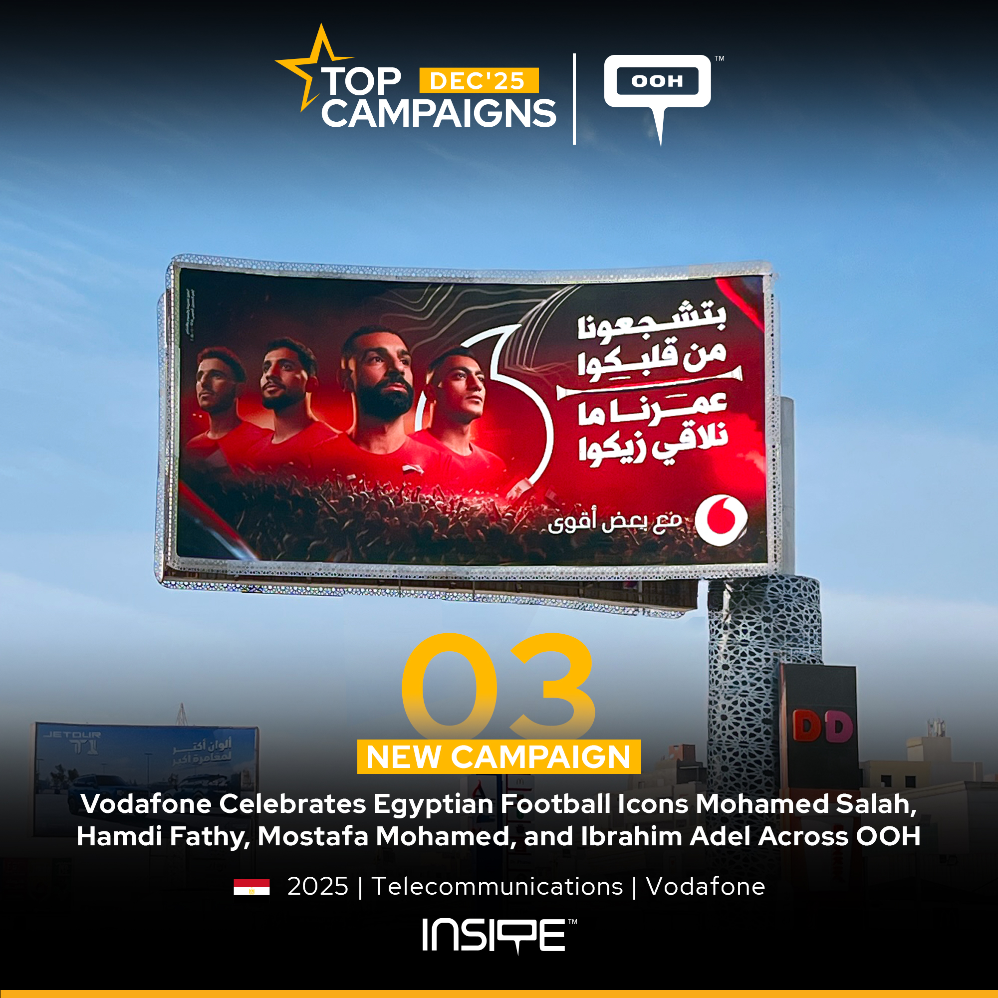 Vodafone’s OOH campaign in Egypt cleverly taps into the nation’s football passion, featuring stars like Mohamed Salah to make a TV promotion feel like a rally. Bold red visuals, cinematic portraits, and layered crowd imagery maximize impact on busy roads. The messaging is clear, highlighting discounts and flexible payments while focusing on shared football moments. By blending commerce with culture, the campaign resonates emotionally rather than just selling a product. Overall, it’s a culturally attuned, high-impact OOH execution that knows its audience.