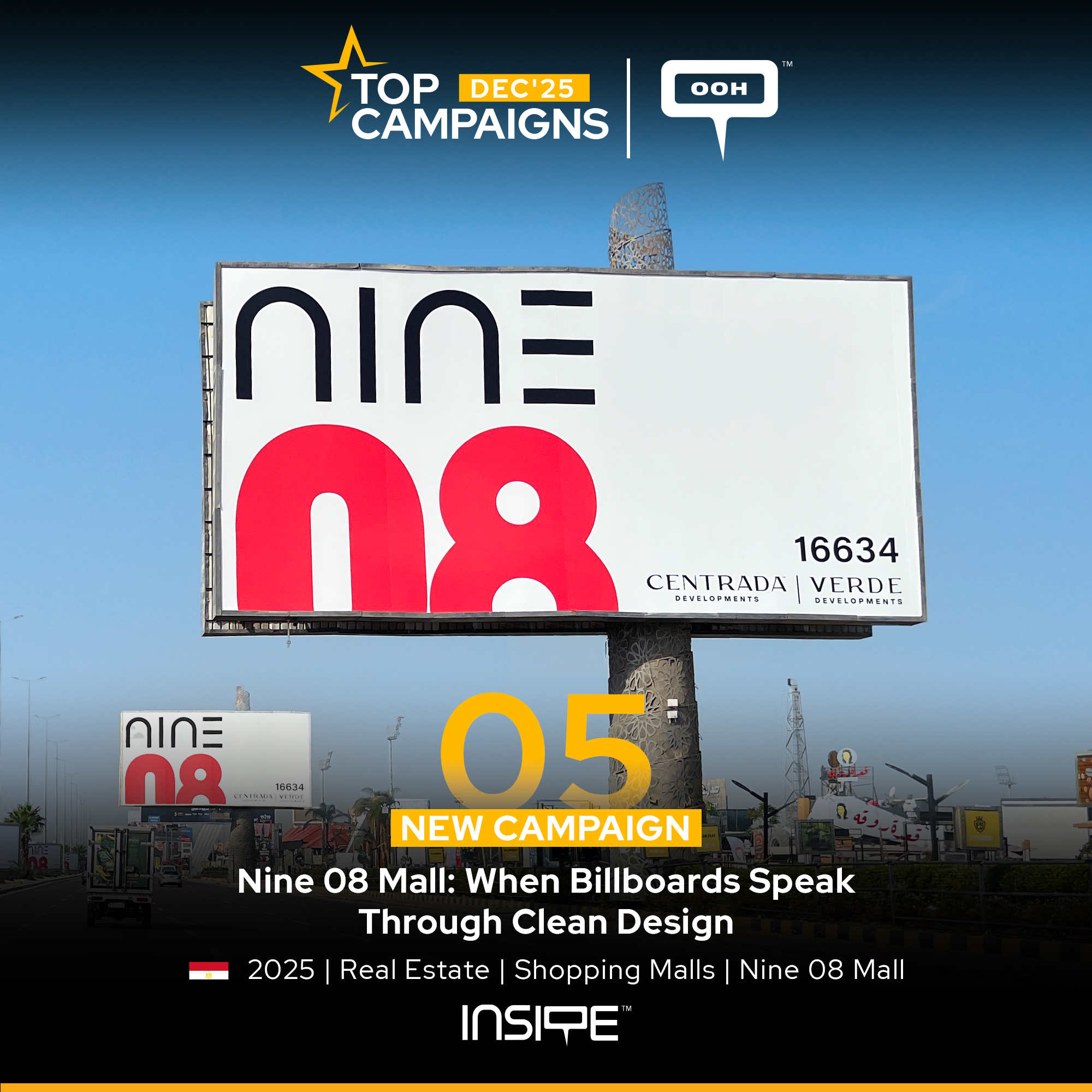 Nine 08’s OOH campaign by Verde and Centrada Developments leverages a clean design—red, black, and white with bold numerics—to create instant visibility and brand presence on Cairo highways. The oversized, geometric typography and ample negative space convey modernity, luxury, and confidence without clutter. Repetition across multiple billboards builds memorability and ownership of the highway stretch. The campaign’s scale and restraint position Nine 08 as a premium, curated commercial destination. Overall, it’s a striking, high-impact OOH execution that speaks through simplicity.