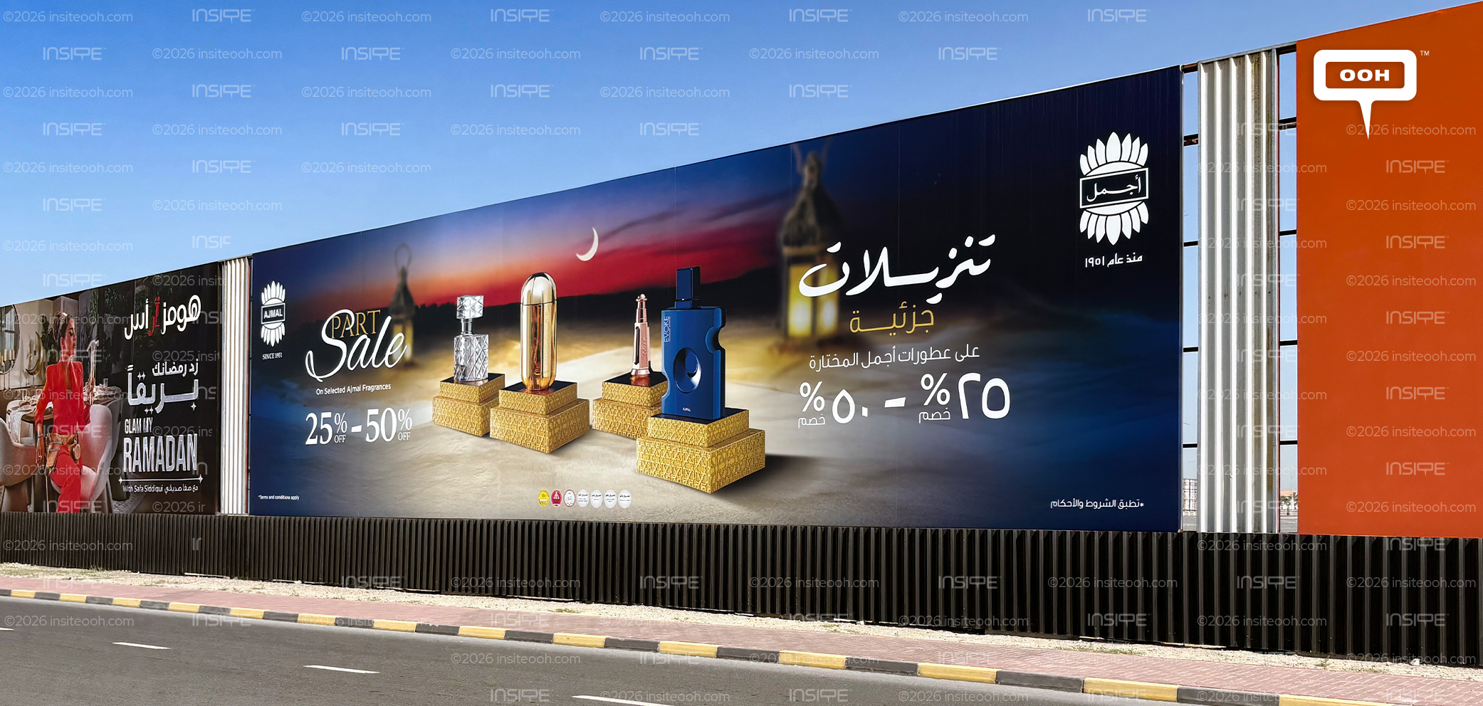 The campaign promotes seasonal offers on selected fragrances, highlighting discounts that range from 25% to 50%. The creative direction reflects the spirit of the holy month through warm sunset tones, lantern visuals, and a calm desert-inspired backdrop that immediately captures attention. The perfumes are displayed like prized pieces, standing elegantly on golden platforms, giving the billboard a premium and festive feel at the same time.