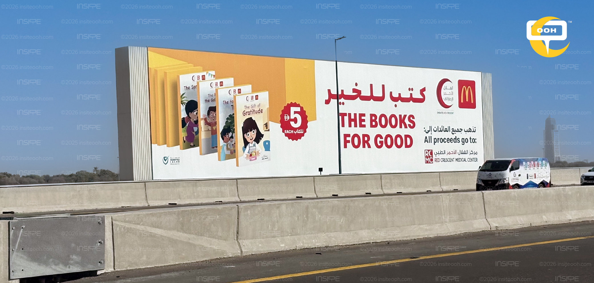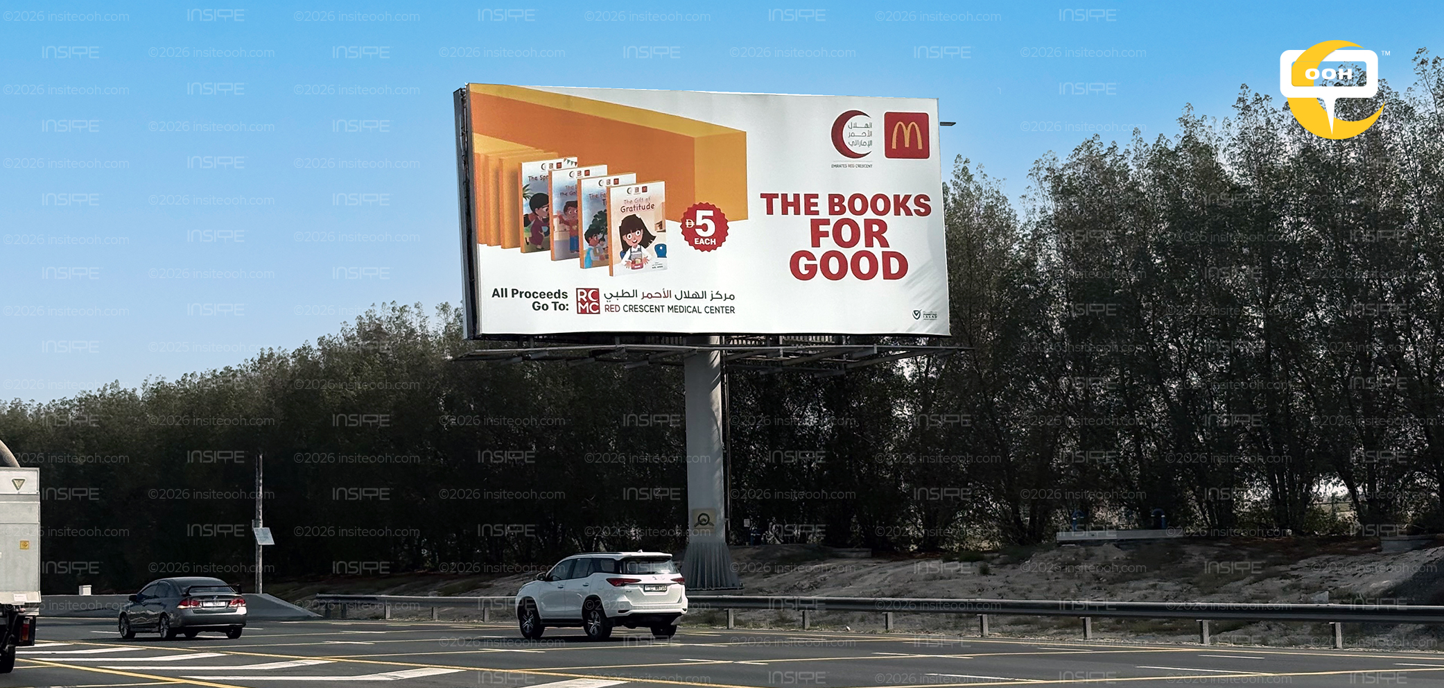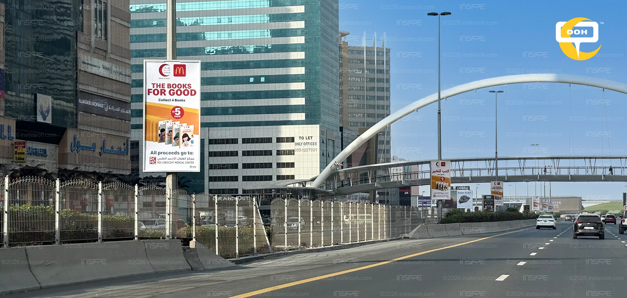 Spread across digital screens, lampposts, and bridge billboards in Dubai, Sharjah, and Ajman, the campaign doesn't compete for attention through visual noise. It earns it through clarity. The creative is warm and uncluttered, leading with "Books for Good" in bold red against a soft beige, letting the idea do the heavy lifting without overdesigning the moment.