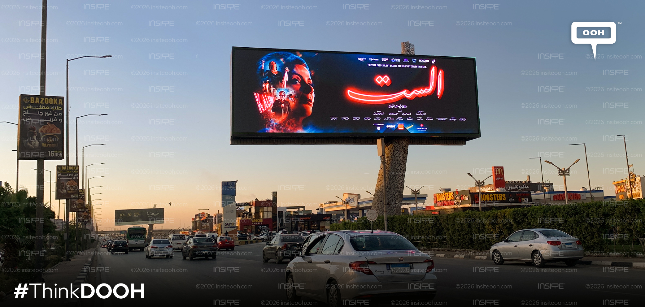 Dominating key billboards, the campaign brings the spirit of Umm Kulthum back to the streets, not as a distant icon, but as a living, breathing force. The artwork relies on a powerful, cinematic portrait that blends performance moments, archival-inspired imagery, and a glowing Arabic typographic treatment of El Sett, creating an instant emotional pull for passersby. It’s less about announcing a film and more about reviving a legend in the public space.