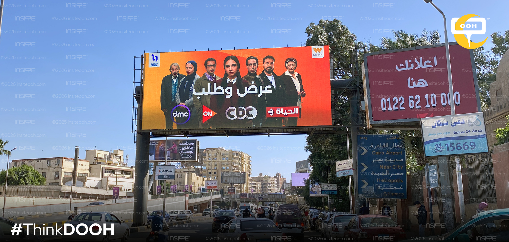 The titles boldly run across the middle in large Arabic font, legible at quick glance. Below them, the familiar logos of the channels DMC, ON, CBC, Al Hayah, and Watch It are prominently placed, serving more than just a purpose of branding, they immediately resolve the most pressing question of Ramadan: where can I watch this? The presence of these logos on multiple billboards reiterates the message of accessibility and availability, placing United Media Services at the forefront of the most eagerly awaited programming of the season.